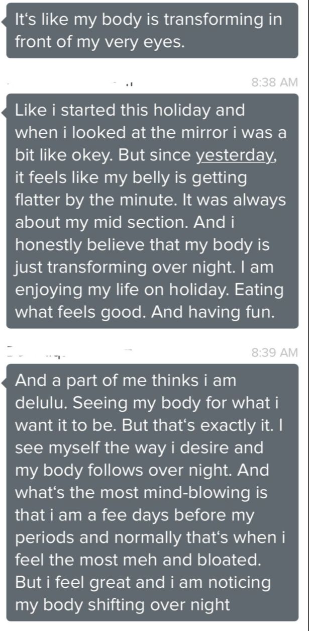 I started healing through Intuitive Eating, which brought me freedom from food but I still wasn't living in body that I wanted. I decided to try applying the principles of manifestation that I had been obsessively studying and dropped 40lbs very effortlessly! After years and years of force and struggle, the insane results I had experienced showed me there was a MUCH better way and since that I've made it my mission to teach the world my method to transform your body and your life... without a single calorie counted.